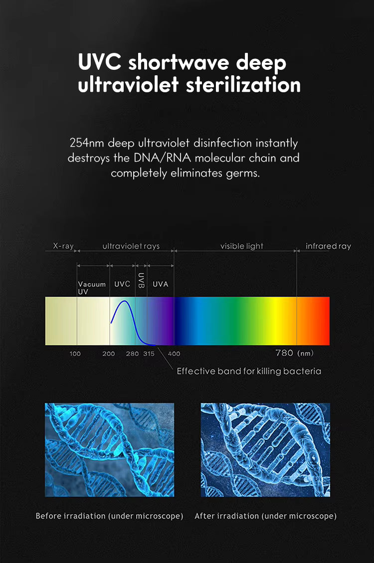 - UV Wavelength: UVC 270–280nm (99.99% kill rate)