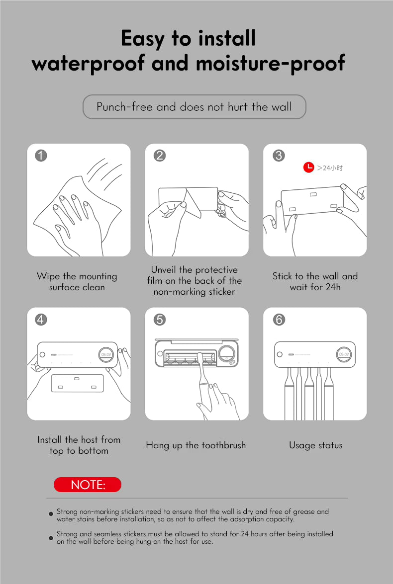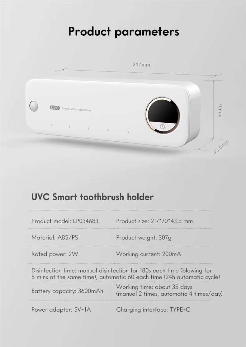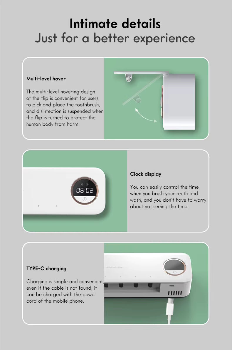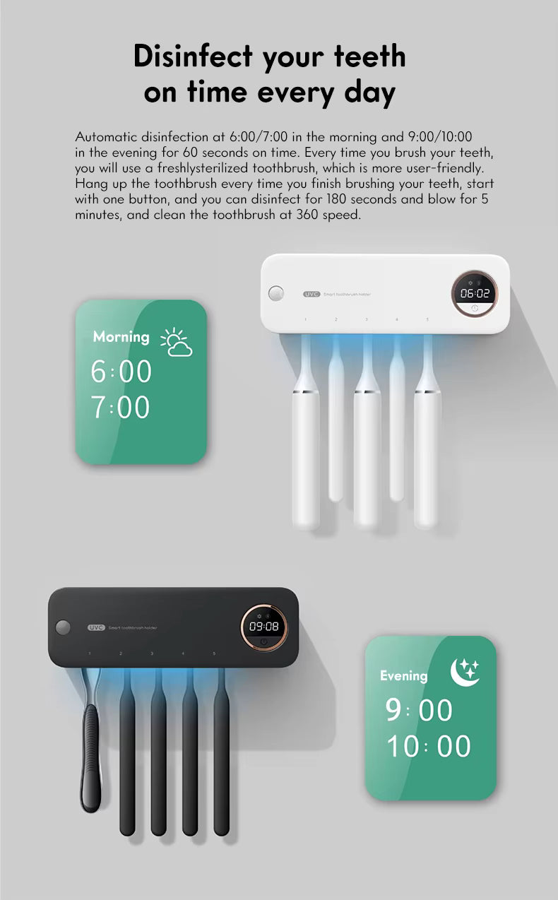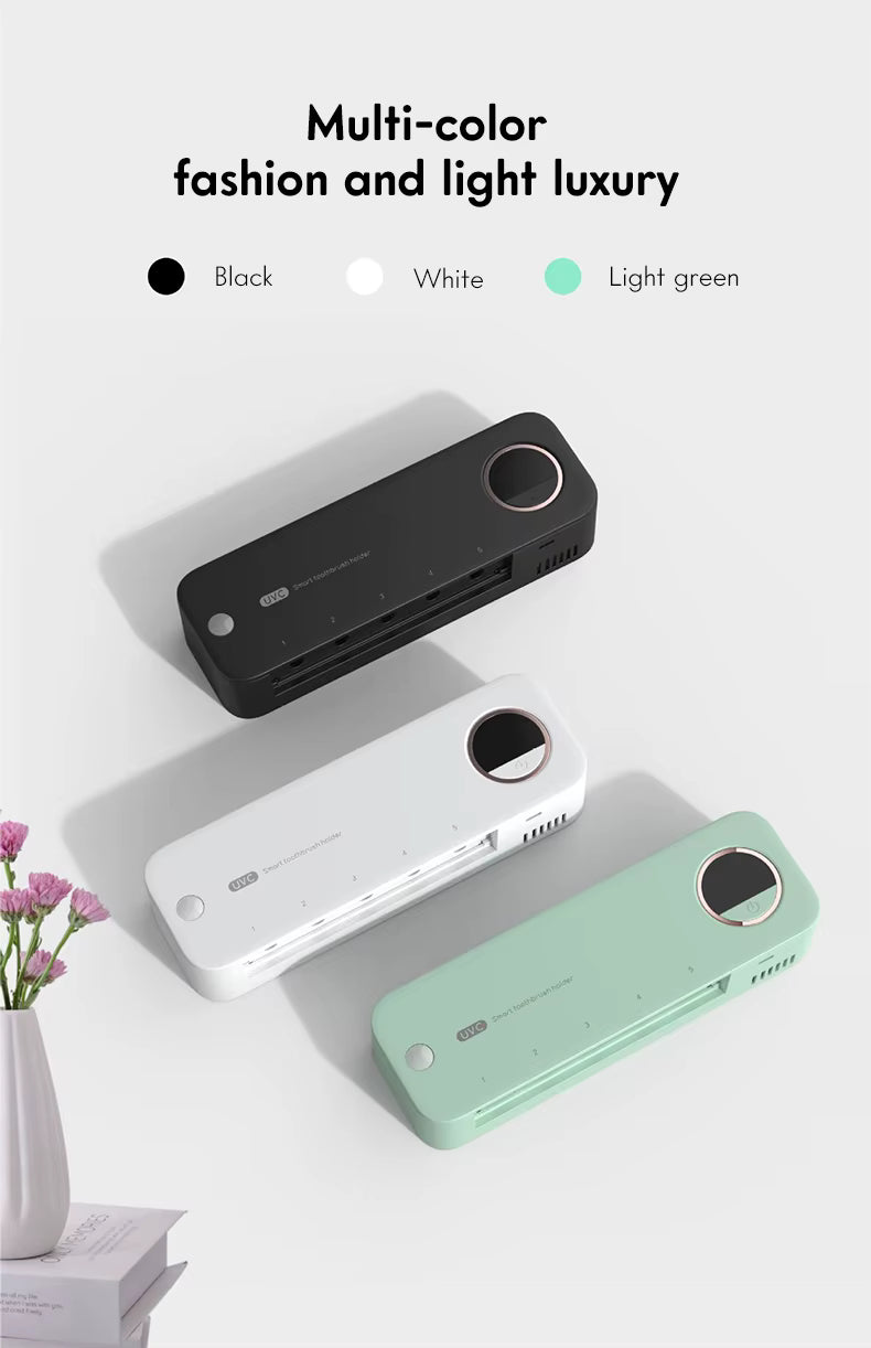 Powered by a 3600mAh long-life battery, it runs over 180 sterilization cycles on a single charge — that’s six months of nonstop protection for your entire family. With space for up to five toothbrushes, including electric models, and no-drill 3M wall mounting, it’s as stylish as it is functional.